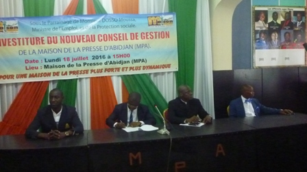 Parrainée par le ministre de l’Emploi et de la Protection sociale, Moussa Dosso, la cérémonie d’investiture du nouveau Conseil de Gestion de la Maison de la Presse d’Abidjan (MPA) a eu lieu lundi 18 juillet dernier. Plusieurs responsables d’institutions de la presse ivoirienne ainsi que les représentants des ministres étaient présents à cette sympathique cérémonie au Plateau. Le 1 er vice-président de l’Union nationale des Journalistes de Côte d’Ivoire (Unjci) monsieur Kanga Rovia a prononcé un discours d’Akwaba aux journalistes et à l’ensemble des invités présents à cette manifestation. Avant de situer le cadre formel de ces retrouvailles. Il a fait savoir que l’Unjci est véritablement au travail avec des résultats probants depuis le 17 avril 2016, date laquelle les journalistes ont renouvelé leurs confiance à monsieur Traoré Moussa alias MT. Boga Sivori, président du nouveau conseil de gestion de la Maison de la Presse d’Abidjan au Plateau (MPA) a introduit que ‘’les pieds ne vont pas là où le cœur n’est pas’’. Ceci dit, il a adressé des remerciements au président de l’Union nationale des journalistes de Côte d’Ivoire (Unjci) pour la confiance placée en lui et les douze membres du conseil de gestion de la MPA. « Nous mettrons tout en œuvre pour mériter cette confiance pour une MPA forte et dynamique », a-t-il fait savoir. Le président Boga Sivori a plaidé le soutien financier et matériel approprié de la puissance de l’Etat ivoirien pour une gestion sans difficulté de la Maison. Grand journaliste proche de l’opposition significative actuelle ivoirienne, Boga Sivori promet de travailler en parfaite intelligence avec un ami, président de l’Unjci, rédacteur en chef du quotidien L’Expression, proche du régime Ouattara. Toute chose qui traduit que l’Unjci est apolitique et géré démocratiquement mais pour le développement du journalisme en terre d’Eburnie. Le président Moussa Traoré très sobre dans sa déclaration a engagé le conseil de gestion a multiplier les initiatives qui permettent de produire de la richesse pour faire face aux dépenses de fonctionnement de la l’ensemble de la Maison de la presse. Chacun doit faire preuve d’imaginations fertiles. Koné Seydou, conseiller technique de la ministre de tutelle, Affoussiata Bamba-Lamine a rapporté que la ministre apporte son soutien plein et entier à la MPA et à l’Unjci dans leur gestion quotidienne ainsi qu’à tous les journalistes ivoiriens. « Bon vent à tous », a-t-il conclu. Quant à Kragbi Dominique, représentant le parrain de la manifestation, Moussa Dosso, ministre de l’Emploi et de la protection sociale, il a indiqué qu’une maison n’est pas facile à gérer. « Le ministre vous encourage et promet de vous recevoir les jours à venir », a-t-il rapporté. Il a par la suite reconnu qu’il y a une différence de grade entre les salaires des journalistes français et ivoiriens, c’est pourquoi le ministre Dosso Moussa ambitionne d’accompagner le conseil de gestion dans toutes ses missions. C’es dans une parfaite ambiance de confraternité que journalistes et autorités invités se sont quittés à la salle de conférence de la MPA. A Tchedé Tcheday