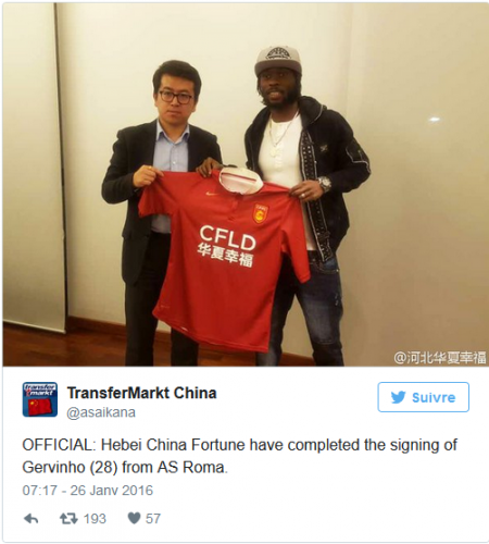 Gervinho (28 ans) va bien poursuivre sa carrière en Chine, après deux saisons et demie passées à l'AS Rome. L'attaquant international ivoirien s'est engagé ce mardi pour trois saisons avec le club de Heibi China Fortune FC. Le transfert serait de l'ordre de 18 millions d'euros.